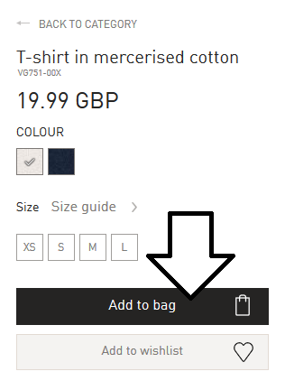 2. Once you have selected size (see "size guide" for measurements) you can add the product to your bag. You may also add it to your "wishlist", from which you will be able to move products to the bag.You can only add available sizes to your bag, whereas your "wishlist" can contain products and sizes currently out of stock (these appear grey). While on the product page you may also check the availability of the product in our London store.