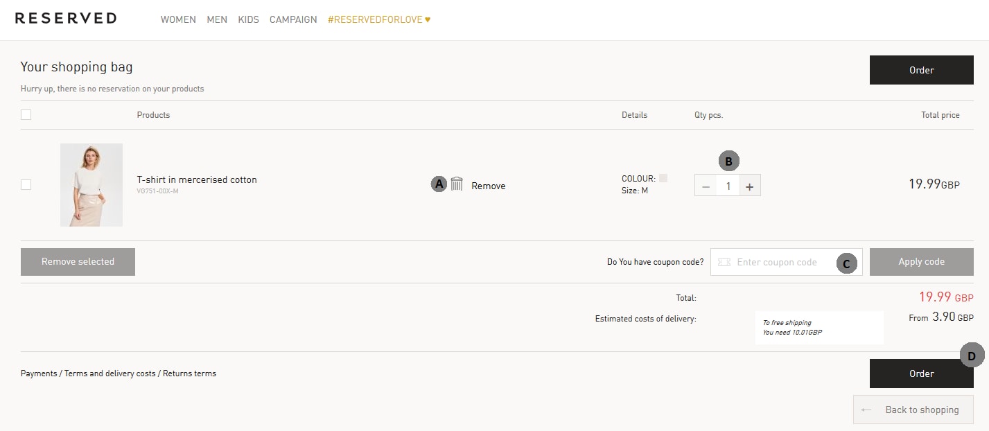 4. Clicking on the bag in the upper right hand corner will take you to checkout, where you can (B) change the number of items you wish to purchase. You can also (A) delete unwanted products from your bag there. (C) is a box for coupon code.
